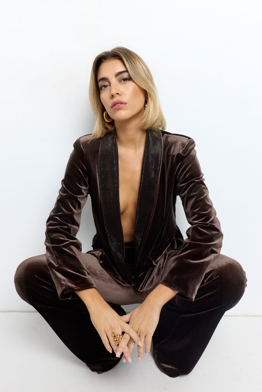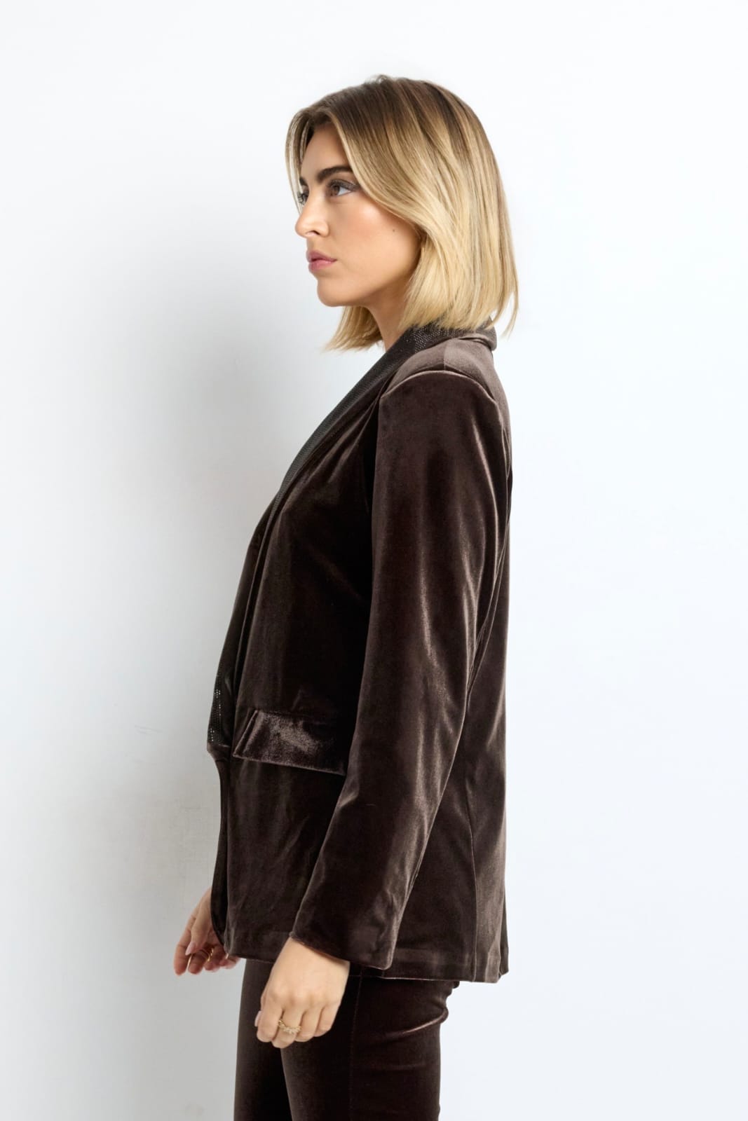 Su escote profundo con solapa satinada, su corte estructurado y su caída impecable estilizan la silueta y elevan cualquier outfit en segundos. Combínalo con pantalón a juego, vaqueros ajustados o vestido… siempre impondrás presencia.